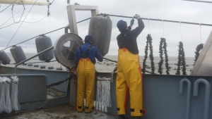 Een korte uitleg over het systeem. De hoofdlijn wordt opgetild door middel van twee davits en in de geleiders gebracht. Met het achterschip in stroom wordt langzaam achteruit gevaren terwijl voorop bij de geleider de snoods aan het invang touw worden geknoopt en vervolgens weer aan de hoofdlijn wordt geknoopt. Dit gaat in een continu proces totdat het laatste tonnetje van die lijn is gepasseerd. Dit is wel te omschrijven, maar moeilijk in te beelden als je het nog nooit met eigen ogen gezien hebt. Nieuwsgierig? Bekijk dan het filmpje opknopen.