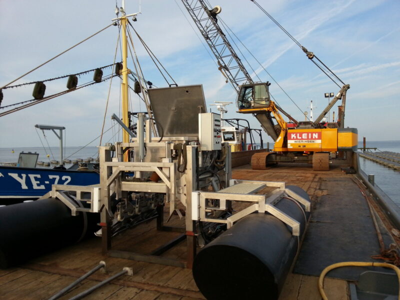 In 2010 zijn we ook begonnen met het ontwikkeling van een automatische oogstmachine, die de naam ‘Zaadgondel’ kreeg. Het idee was dat deze Zaadgondel zelfstandig over de hoofdlijn van de MZI zou rijden en de snoods, dit zijn de touwtjes waarmee we het invangsubstraat aan de hoofdlijnen knopen, doorsnijden. Het principe was geboren op een wintersportvakantie in Oostenrijk. De kabel van een skilift loopt over/tussen loopwielen. De paal waar de wielen aan zijn bevestigd staat constructief vast opgesteld en de kabel wordt aangedreven. Dit principe hebben we omgedraaid, de lijn als vast en de oogstmachine als aandrijving. Dit project hebben we samen met machinefabriek Bakker opgestart en uitgevoerd. Het heeft heel wat tijd gekost om de Zaadgondel werkend te krijgen. De wielen werden hydraulisch aangedreven en waren te stabiliseren. De Zaadgondel hebben we op een korte proeflijn in de haven getest en het één en ander aangepast aan de drijfconstructie en de afstellingen goed afgeregeld. In 2012 hebben we de zaadgondel uitgebreid getest op de Waddenzee en ondervonden we problemen met het passeren van de drijvers. In 2013 hebben we in juni, voor de start van het mosselseizoen op de Oosterschelde getest. De uitkomst was dat het project Zaadgondel niet is geslaagd! Een van de problemen was onder andere het rijden over de hoofdlijn. Het was voor nu te complex om de wielen gelijk naast elkaar te laten rijden. De hoofdlijn liep met regelmaat uit de wielen. Aangroei van wieren en dergelijke zorgden voor problemen. Ook de weersomstandigheden speelden een grote rol; onrustig water, stroom en wind.
