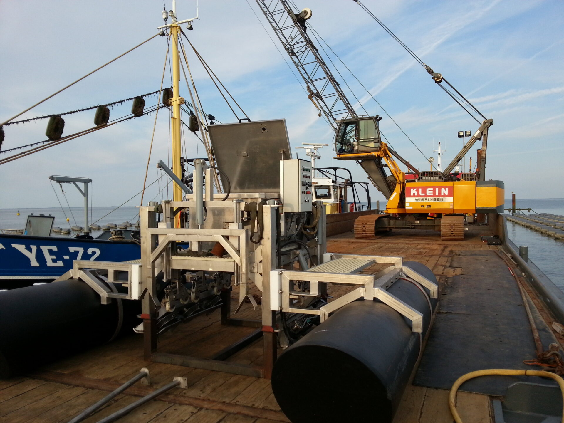 In juli 2013, net voor het oogstseizoen, werd er een nieuw idee geboren! De hoofdlijn in een geleider aan de zijkant van het schip en dan in een vloeiende beweging langzaam langs de lijn. Om op korte termijn dit te testen hebben we zelf een geleider gemaakt aan de voorzijde van het schip. Al snel bleek dit een groot succes! De MZI lijn in de geleider en langzaam vooruit varen met de kop in stroom, wat was het opeens eenvoudig. Wat hadden we in de afgelopen jaren ons zelf suf gepeinsd op iets wat niet wilde lukken. Zo gaat dat. De eerste stap naar automatisering was voor ons gezet!