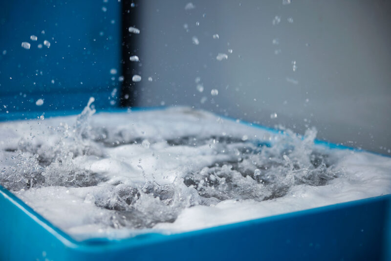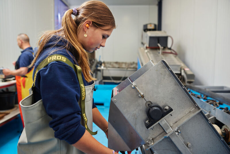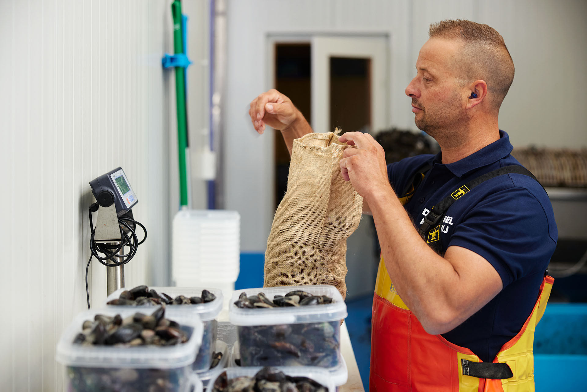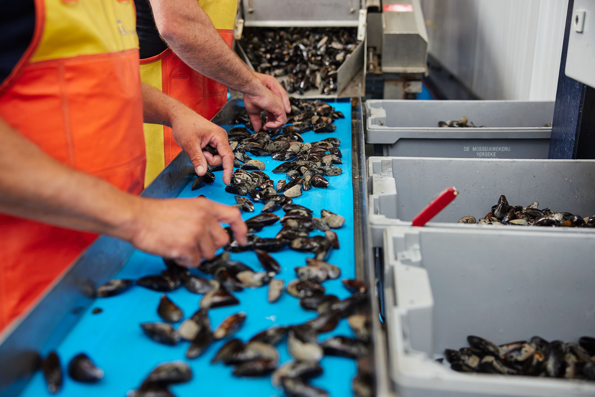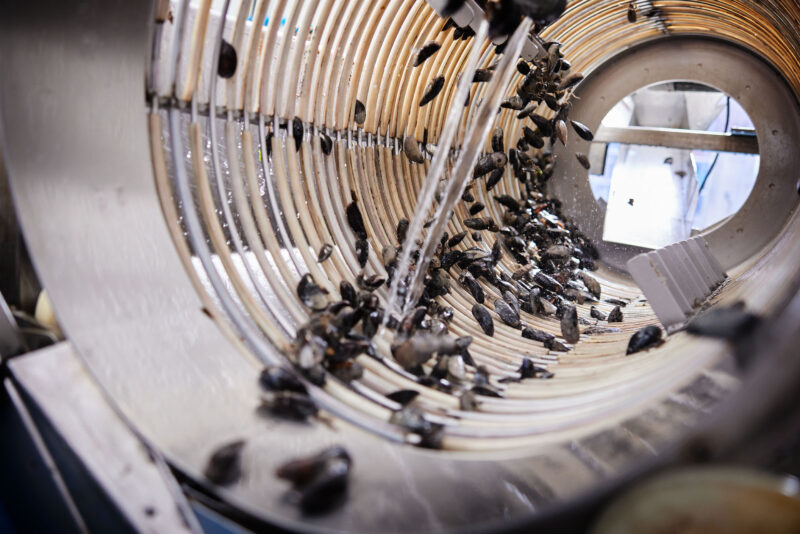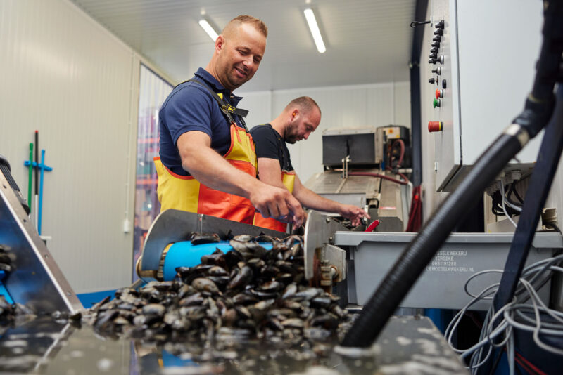 Als de Zeeuwse mosselen zijn opgevist in de Oosterschelde gaan ze het verwatersysteem in. Hier worden ze zandvrij gespoeld met zuiver helder Oosterschelde water. Als ze zandvrij zijn worden de mosselen in de mosselloods schoon gespoeld en ontbaard. Na een handmatige selectie worden de mosselen gekoeld in een koudwaterbad van zuiver Oosterschedewater zodat ze goed vers blijven.