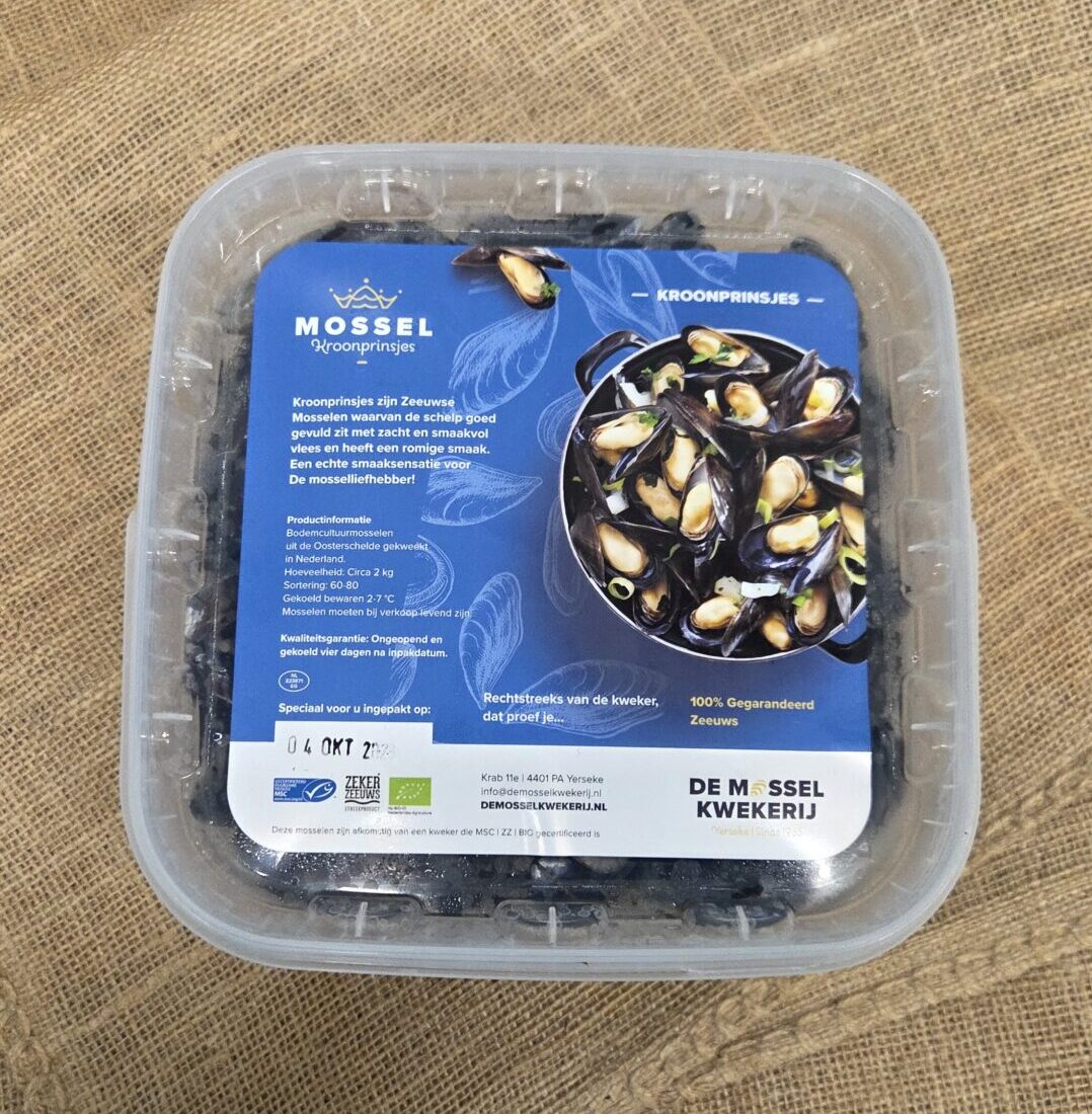 Verse Zeeuwse Mosselen 2kg verpakking. Onze Zeeuwse mosselen zijn 100% Zeeuws en biologisch gecertificeerd.  Omdat ze nog maar 1 jaar oud zijn hebben ze een boterzachte structuur en is dit echt een smaaksensatie! We noemen deze mosselen Kroonprinsjes ze zijn net iets kleiner dan de Mosselkoninkjes. Onze Zeeuwse mosselen zijn ongesorteerd 60-80 in een kilo.
